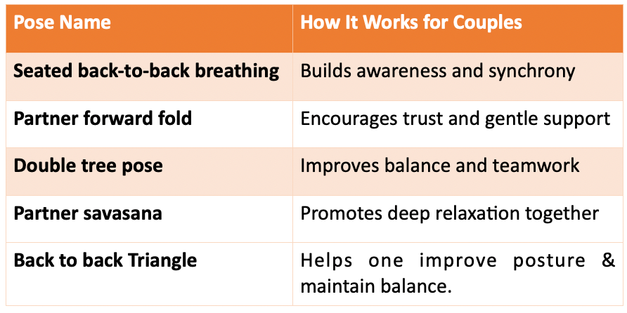 Several poses naturally invite closeness and cooperation, as these asanas are less about physical perfection and more about shared experience Here are some such postures in the table below.