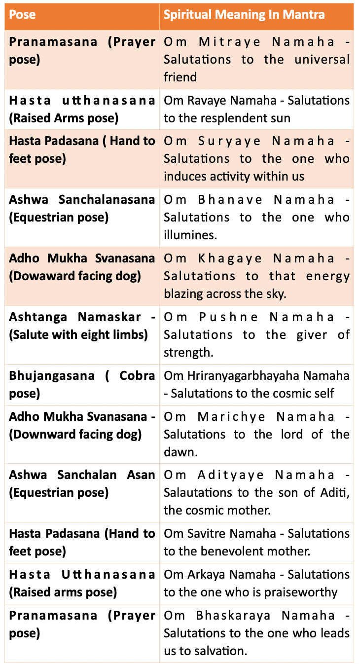 Our love for the Sun, who is worshipped as a deity, is reflected in the ‘mantras’ which accompany each posture, as shown in the table below: